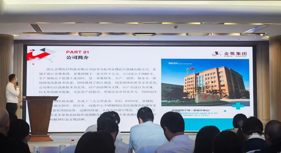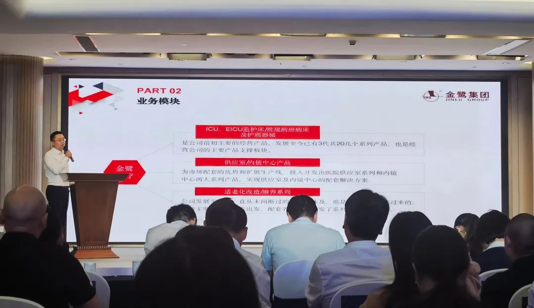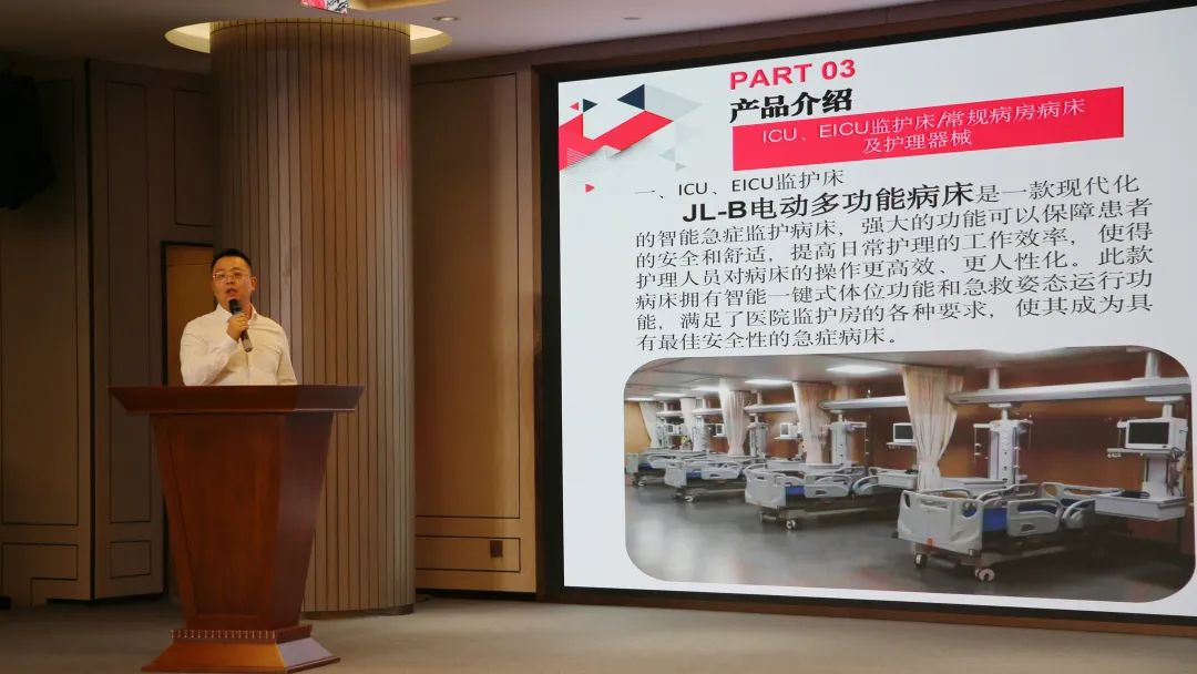 在主旨演讲环节中,荣耀(中国)总经理杨仁从公司简介、业务模块、产品介绍三个方面三个板块出发,向参会人员全面介绍公司的发展历程及公司生产线、拳头产品,并欢迎在座的各位专家、企业代表、机构代表进行深度交流。杨总指出,荣耀(中国)经过二十多年的发展,已形成了三大主营业务——ICU、EICU室、常规病房病床及相关附件;供应室、内镜中心不锈钢制品;高端康养护理床系列。荣耀(中国)凭着优质的品质、人性化的设计理念,与省内外多家知名医院形成战略合作关系,以专业成就品质,以责任与务实的精神打造金鹭品牌。